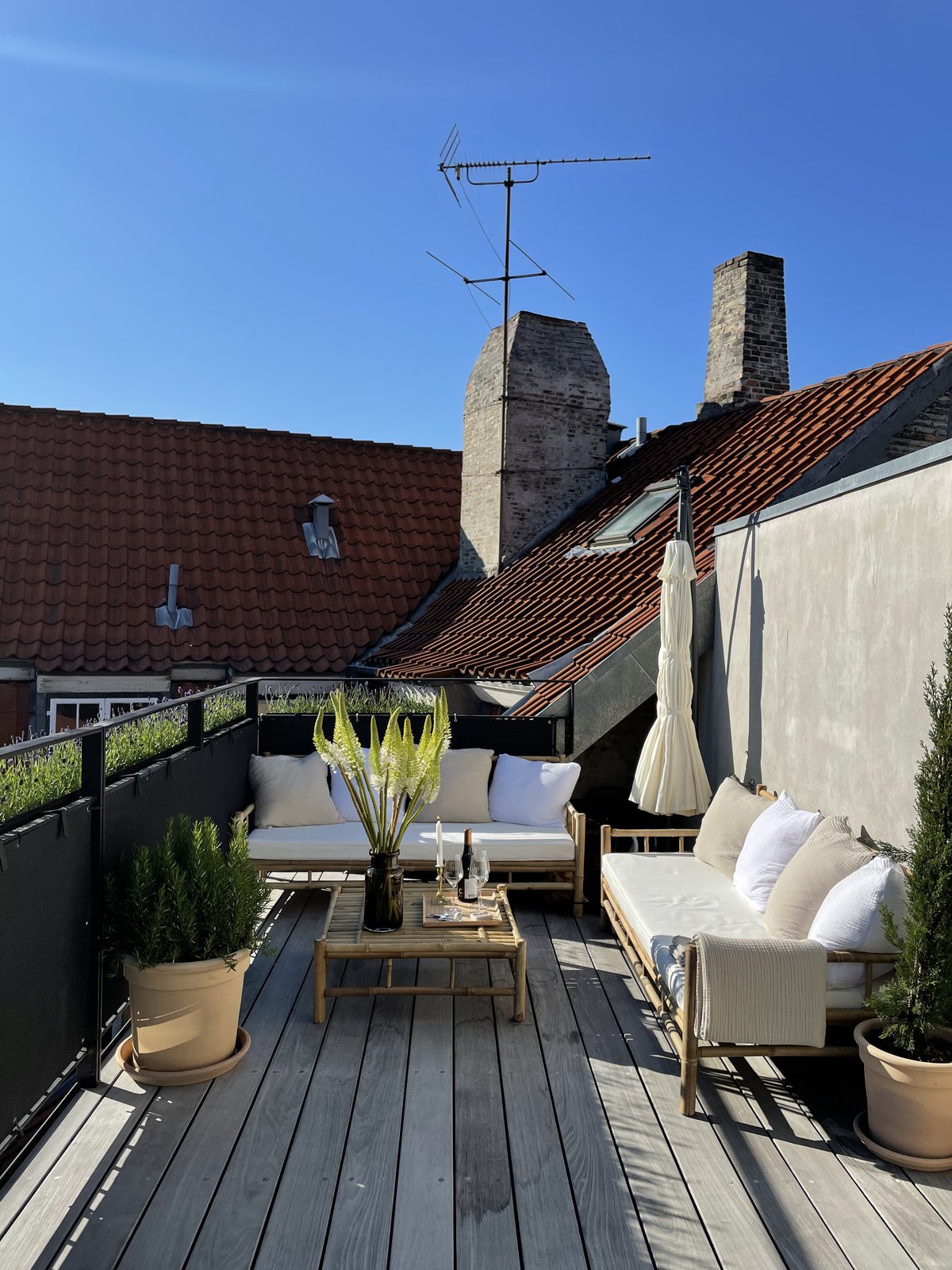 Victoria Quitzau har I samarbejde med Tine K Home transformeret tagterrassen i hendes smukke hjem i indre by, som både er æstetisk smuk og hyggelig. Bambus møblerne sammen med planterne skaber en udenlandsk stemning.
