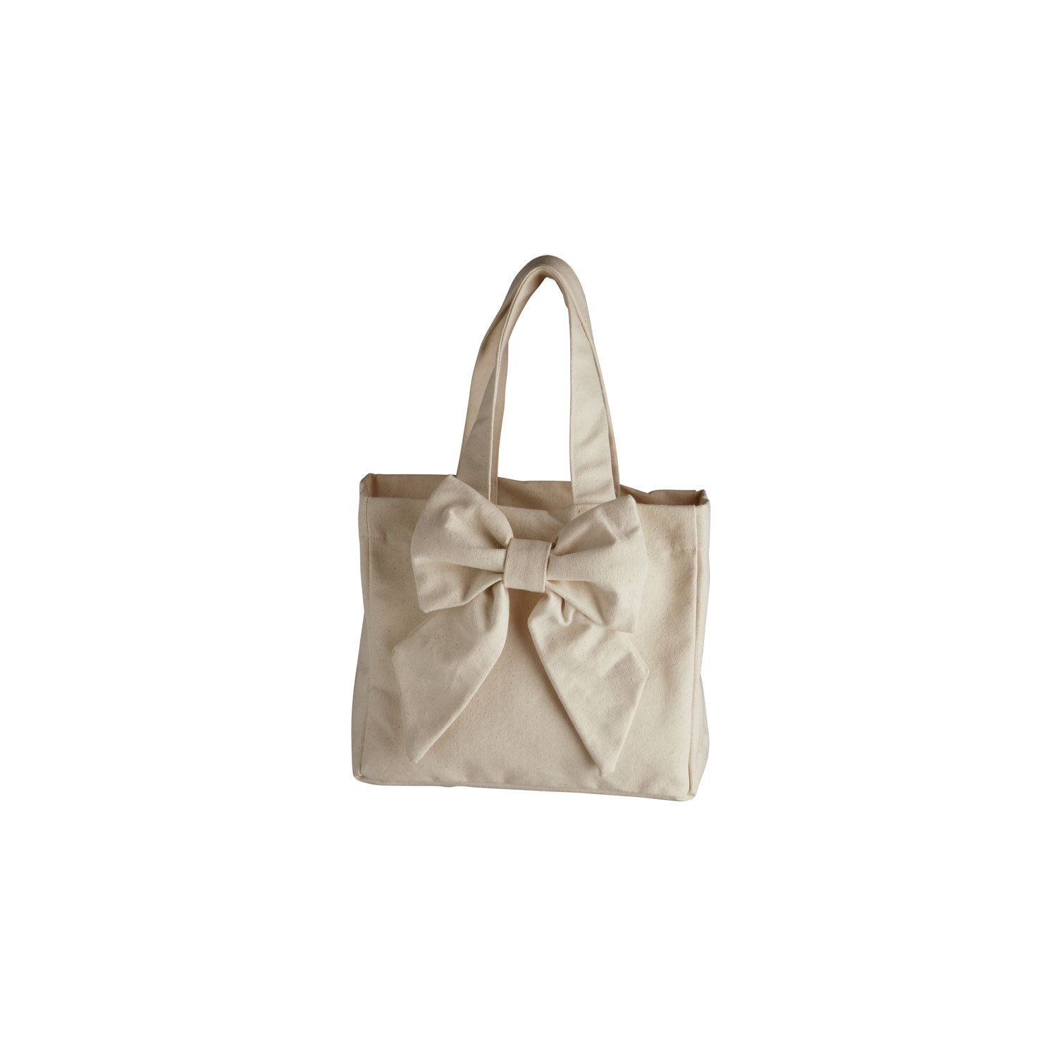 Lille taske i cremefarvet bomuldskanvas med en dekorativ sløjfe foran. God som gaveindpakning eller til små hverdagsting.