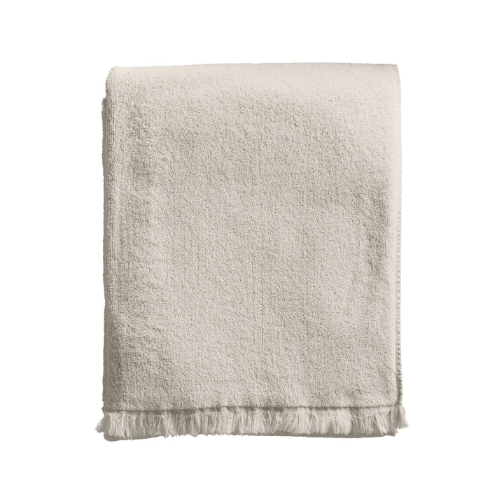 Håndklæde i bomuldsfrotté med små frynser langs kanten. Den tætte frotté gør håndklædet blødt og absorberende, mens de rolige farver sand og mocca giver et afslappet udtryk på badeværelset.