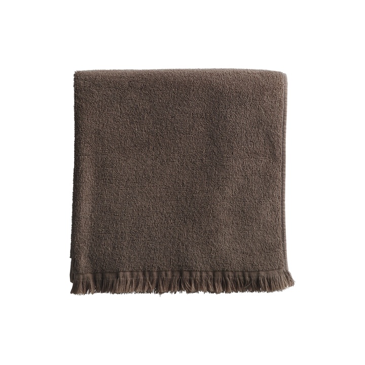 Håndklæde i bomuldsfrotté med små frynser langs kanten. Den tætte frotté gør håndklædet blødt og absorberende, mens de rolige farver sand og mocca giver et afslappet udtryk på badeværelset.