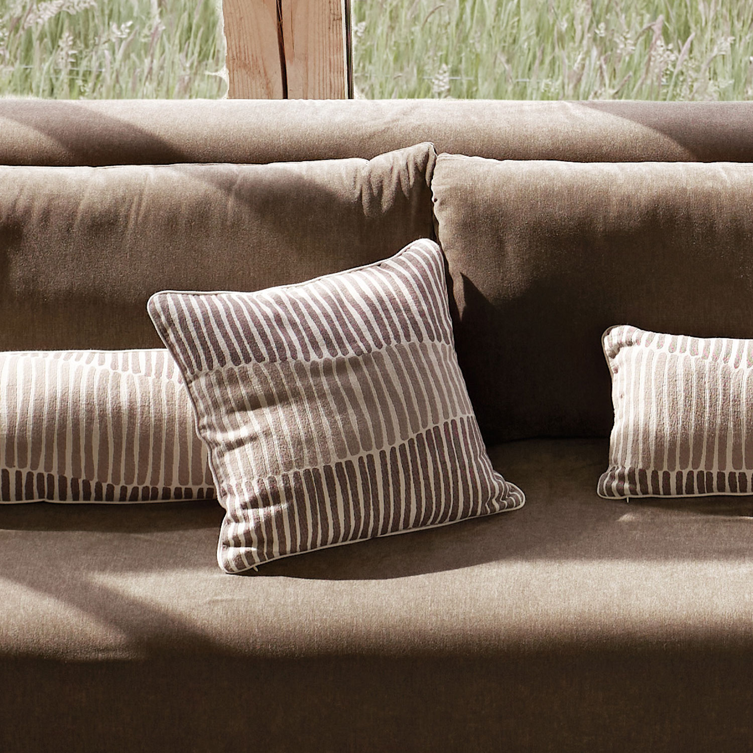 Stofstykkerne i LANE-kollektionen stammer fra ét stort mønstret kanvas. Derfor er hvert pudebetræk i LANE-serien helt unikt.