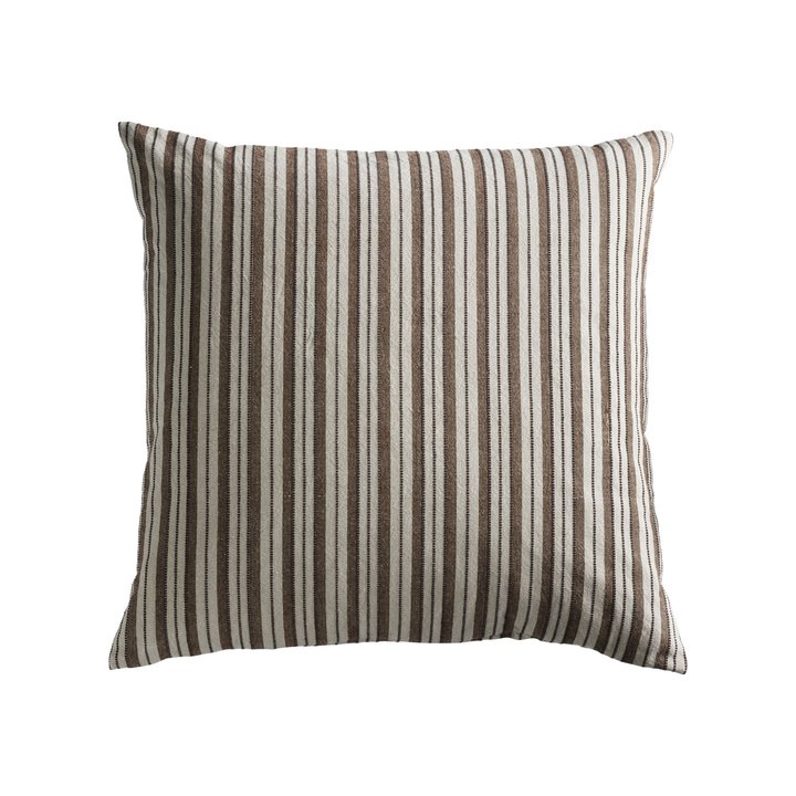 Vores pudebetræk i Maru-serien er fremstillet i blød, genanvendt bomuld med klassiske striber i varme nuancer. Overskydende bomuldsaffald fra produktionen findeles, blandes med polyester og spindes til nye, stærke garner. Det tidløse design gør puderne nemme at kombinere med andre farver og teksturer på tværs af hjemmets rum.