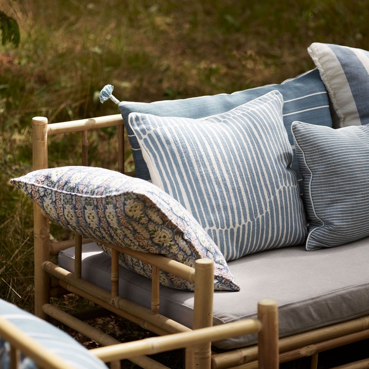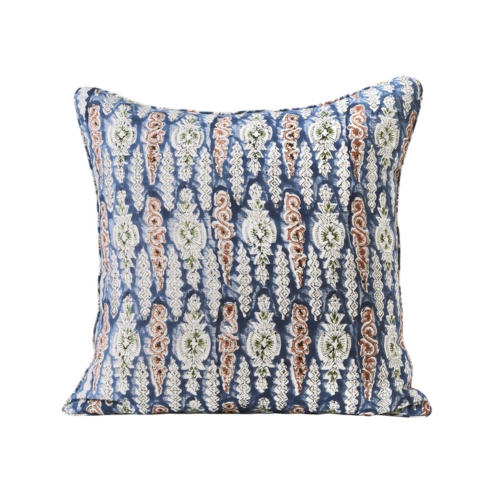 Dette pudebetræk designet ved brug af den traditionelle indiske blokprint-teknik. Printet på pudebetrækket er håndlavet og viser forskellige mønstrer, hvilket gør produktet til et statement piece.