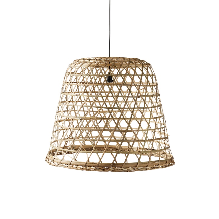 Markedskurv lavet om til en lampeskærm. Lampeskærmen giver et dekorativt lysspil og er fin at bruge over spisebordet eller køkkenbordet.