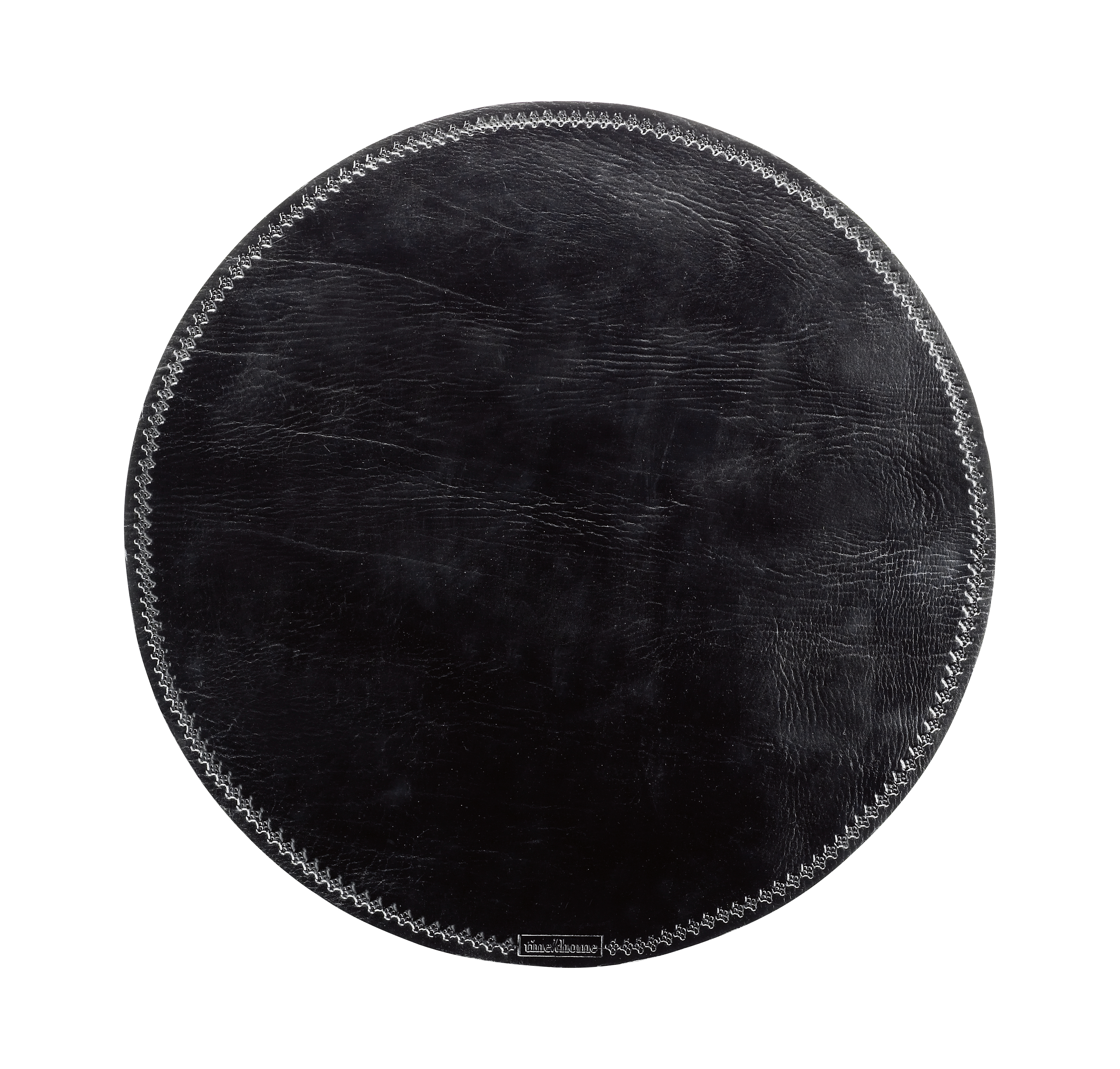 Håndlavet dækkeserviet i sort læder. Dækkeservietten kan også bruges som skriveunderlag og måler D 40 cm.