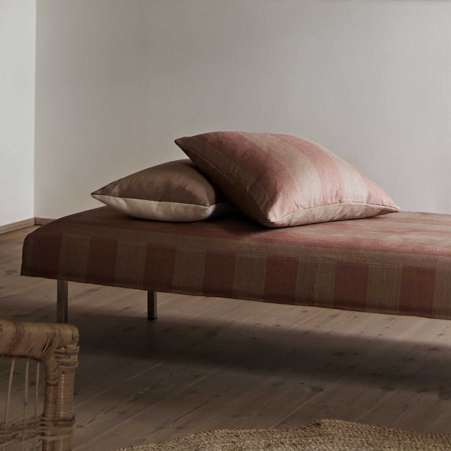 Dette er Jopmega55-oldrose. Et pudebetræk i en hazel-farve med striber i farven oldrose, som tilføjer varme til indretningen.