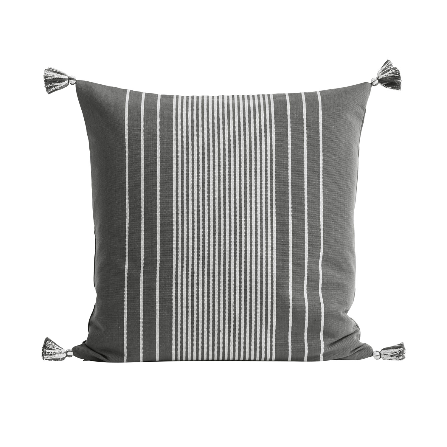 Tilføj et opløftende element til din indretning. Canvas pudebetræk i bomuld. Vævede striber sammen med kvasterne fuldender pudens udtryk.