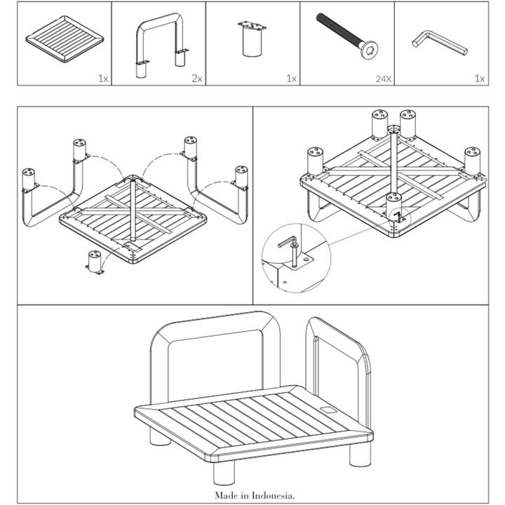 Udover det høje indhold af naturlig olie i træet, der gør serien velegnet til udendørs brug, er møblerne også naturligt slebne og behandlet med en vandbaseret topcoating for beskyttelse. Over tid vil træet få en smuk, naturlig grålig patina. Hvis du vil bevare teakens varme farve, skal du behandle møblet med udendørs træolie.
