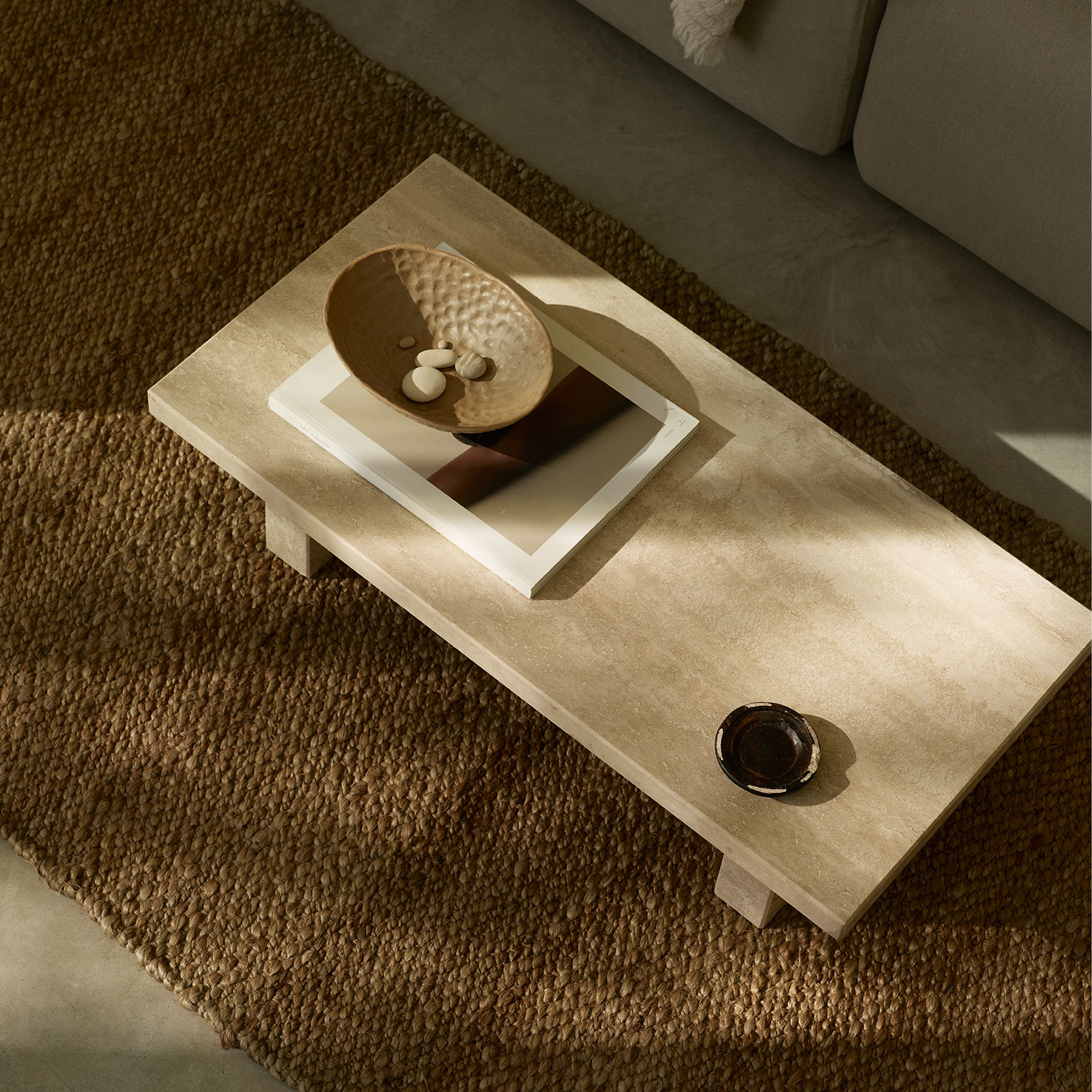 Fra naturmaterialet travertin har dette bord en smuk variation i farve og udtryk, som gør hvert produkt unikt. Bordet er robust og kan bruges som sofabord, i stuen eller gangen til opbevaring af bøger og planter.