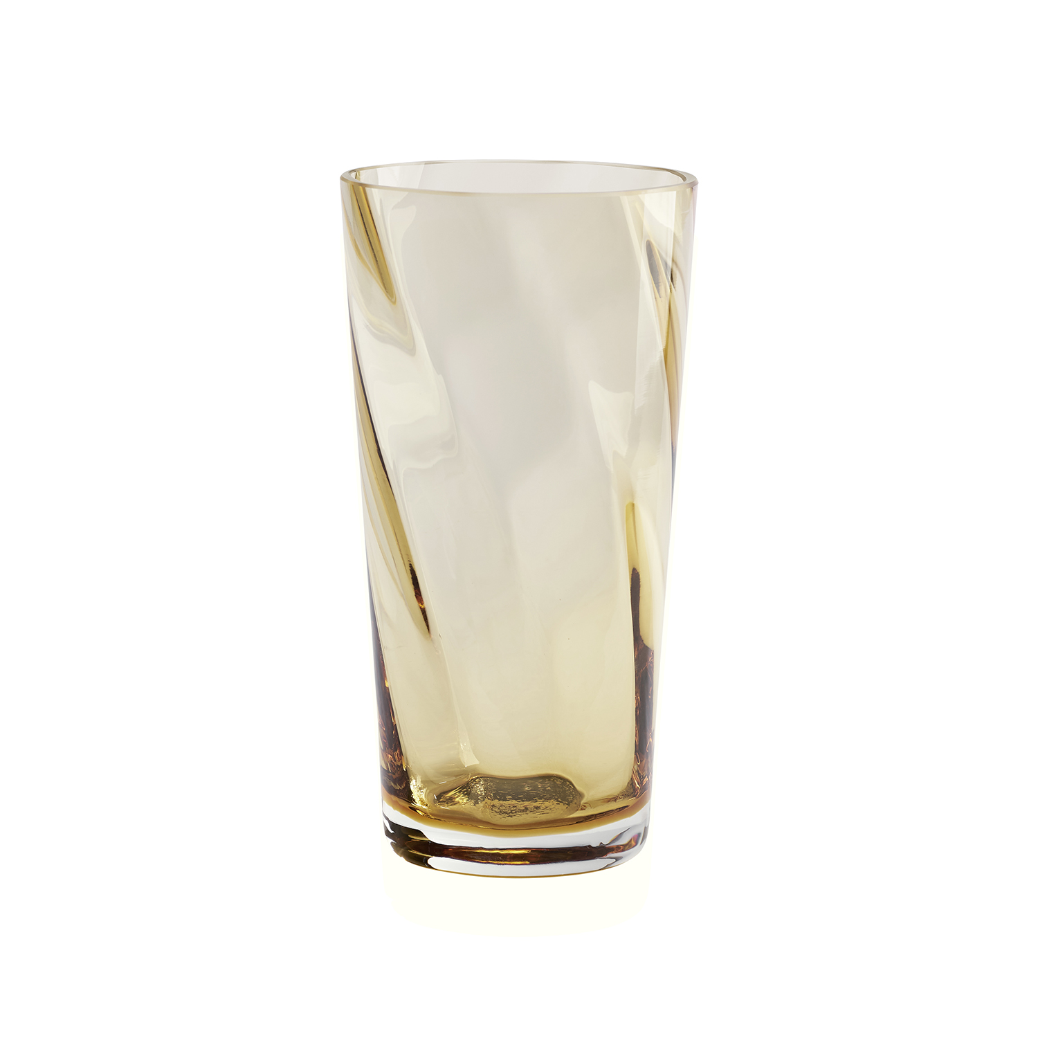 En mundblæst, snoet vase i farven amber. Refleksionen af glasset ses tydeligt på grund af det smukke gennemsigtige farvede glas. Fyld vasen med nogle små tørrede blomster eller brug den med et lys i.