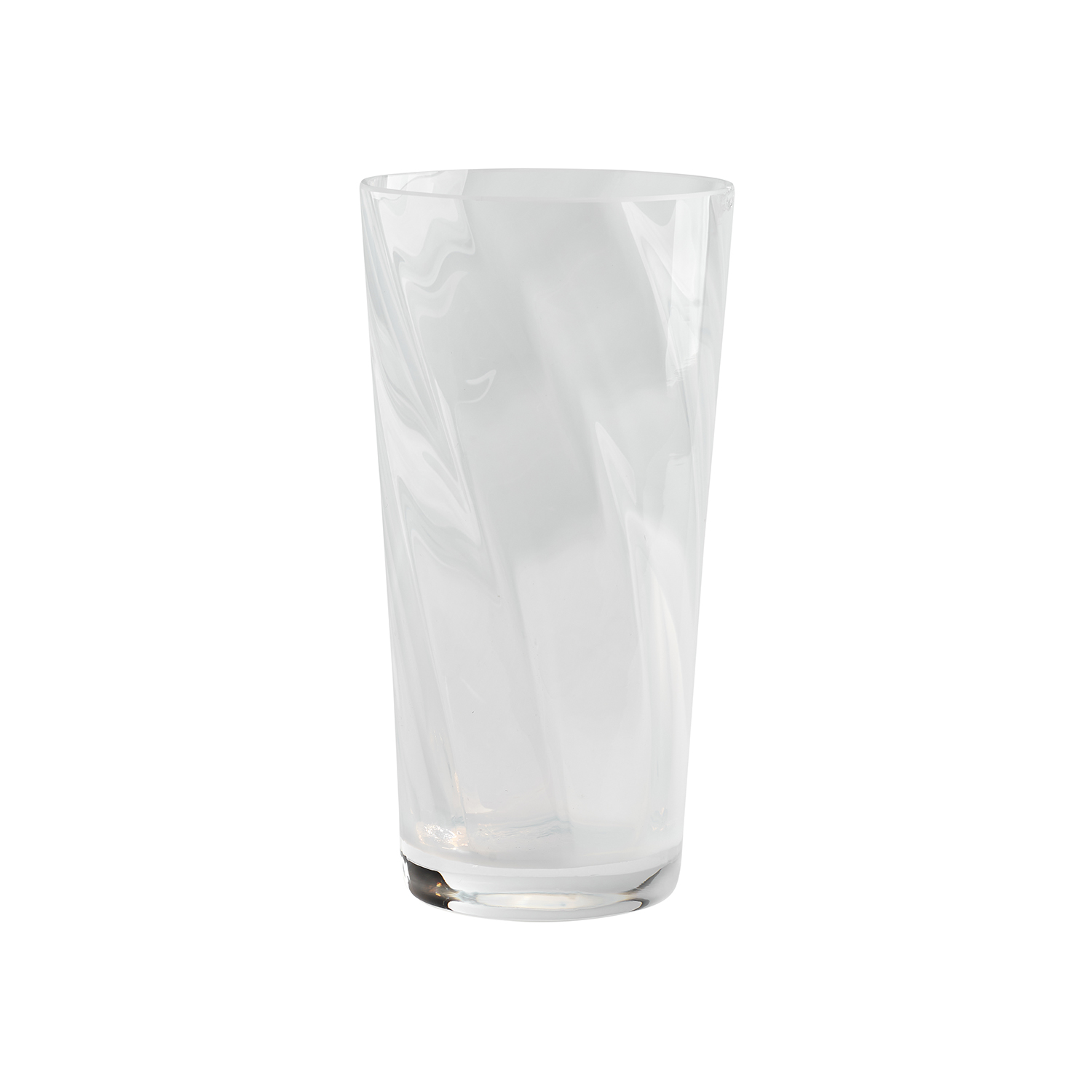 En mundblæst, snoet vase i farven milk. Refleksionen af glasset ses tydeligt på grund af det smukke gennemsigtige farvede glas. Fyld vasen med nogle små tørrede blomster eller brug den med et lys i.
