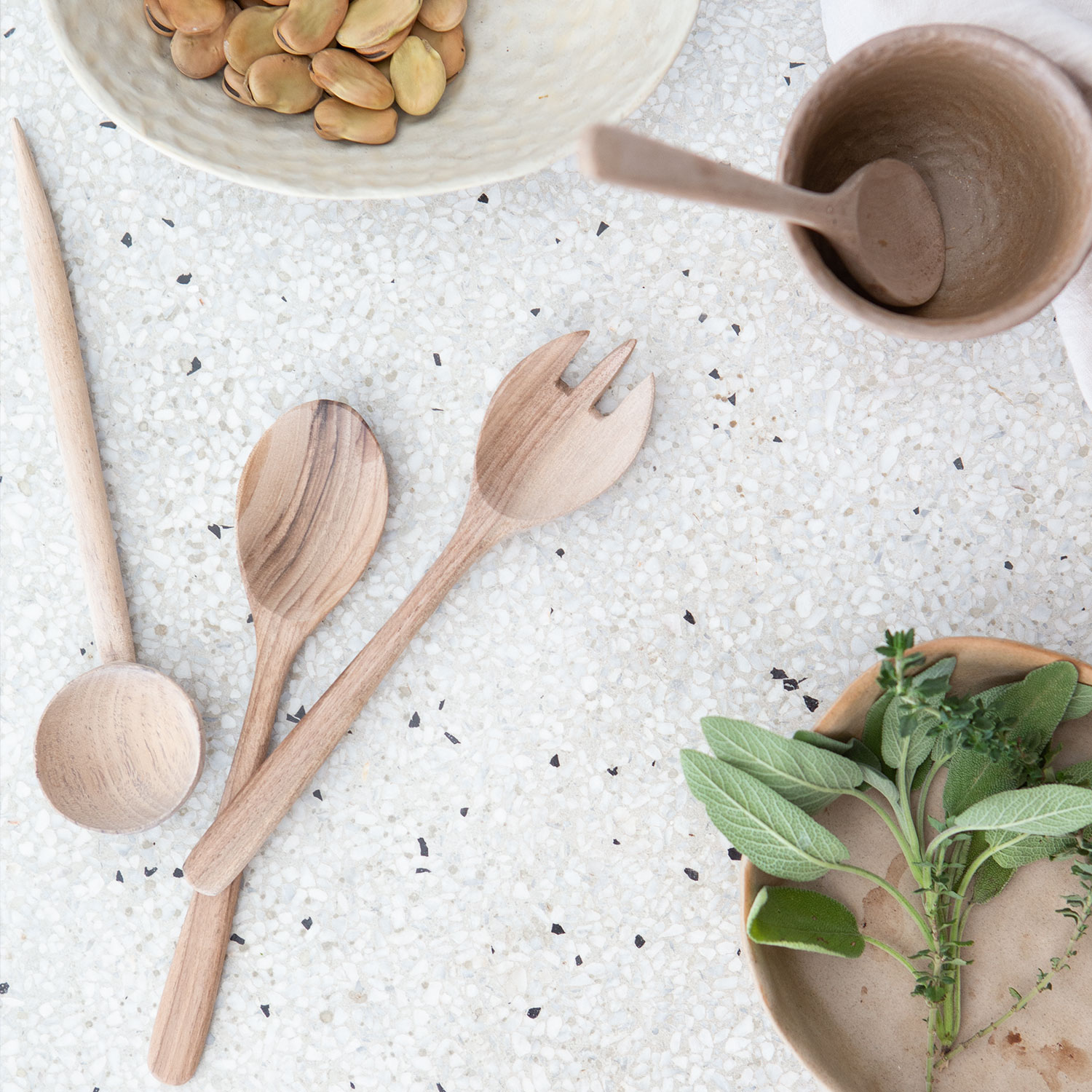 Flot salatbestik i valnøddetræ. Disse salatsæt er håndlavede, så ikke to sæt er ens. Køkkenredskaber af træ skåner dine gryder og pander, og frigiver ingen skadelige kemikalier. De er derfor velegnet til køkkenbrug.