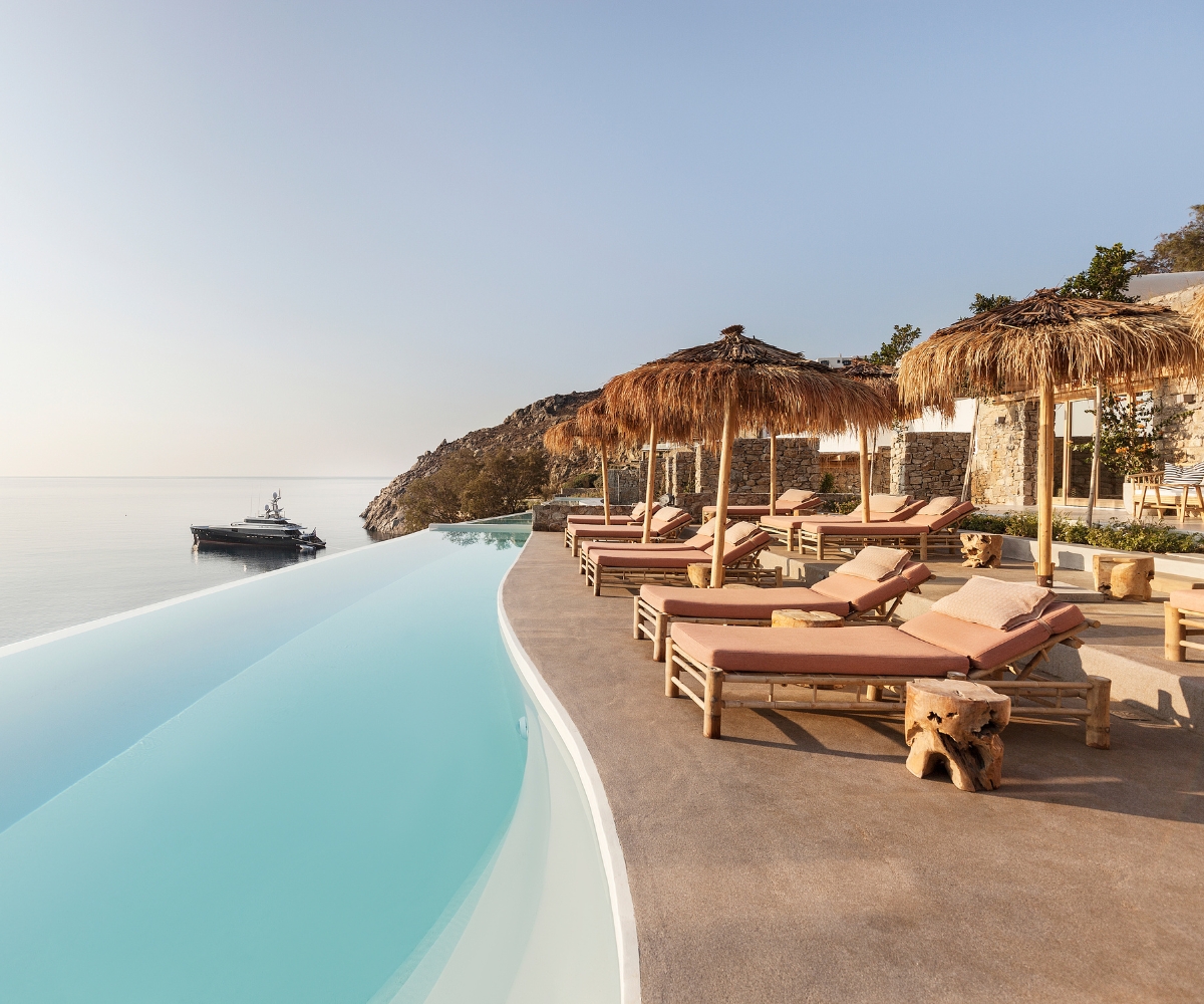 The Wild Hotel has the most beautiful location. It is placed on the tip of Mykonos with a view over a little beach and a village, which once was named "the wild ones" by the locals. This name was given because it hosted the bravest fishermen of Mykonos for a long time.