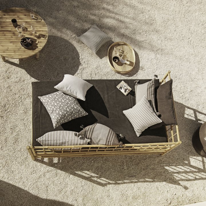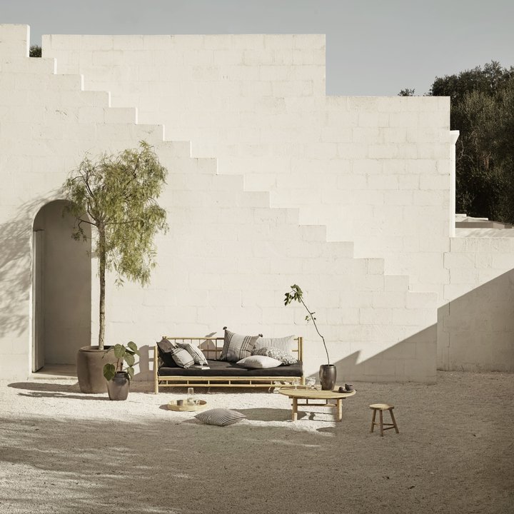 Round bamboo coffee table for both indoor and outdoor use. The table can be used as a coffee table or as a lounge table on the terrace. Fill the coffee table with white pots and green plants to create a natural and botanical look.