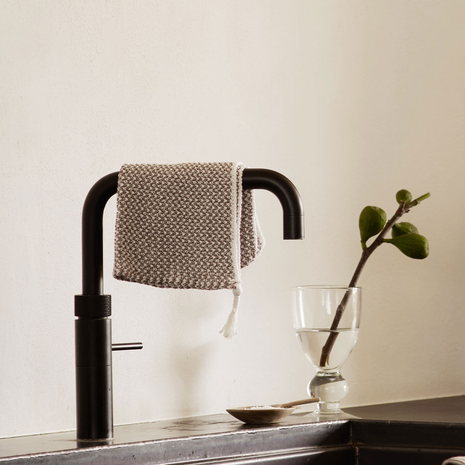 A knitted dishcloth made from natural fibres can be used and washed again and again. A small decorative tassel in the corner makes the cloth a beautiful alternative to a napkin.