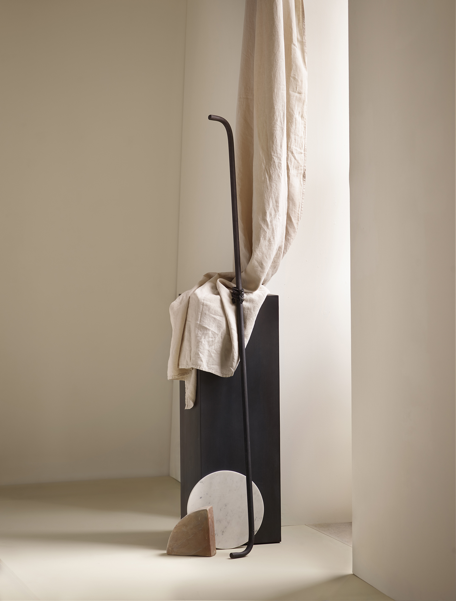 Handmade curtain rod in black iron that beautifully frames the windows with soft floating fabrics.