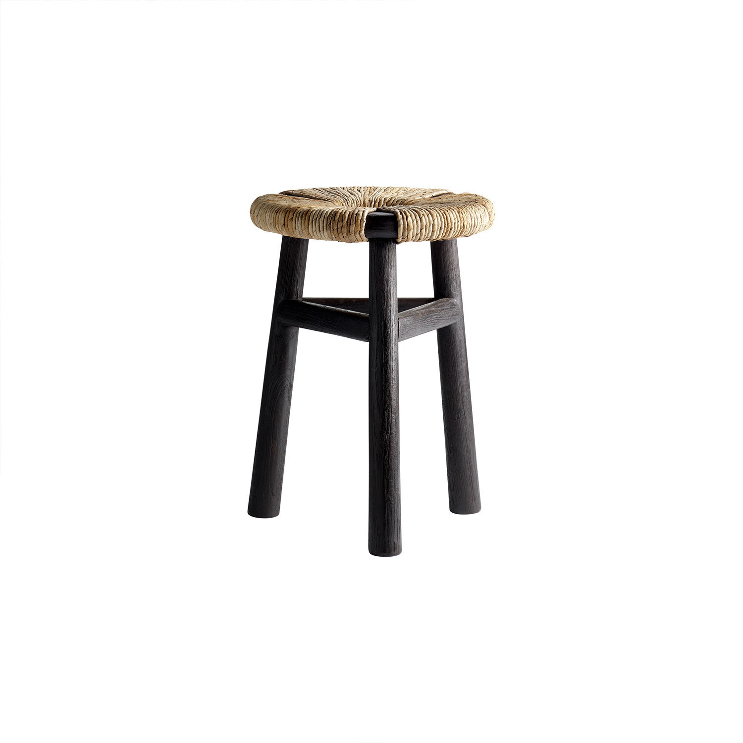 Handmade stool from our Kayu series in dark brown FSC-certified recycled teak with a seat woven from banana leaf.