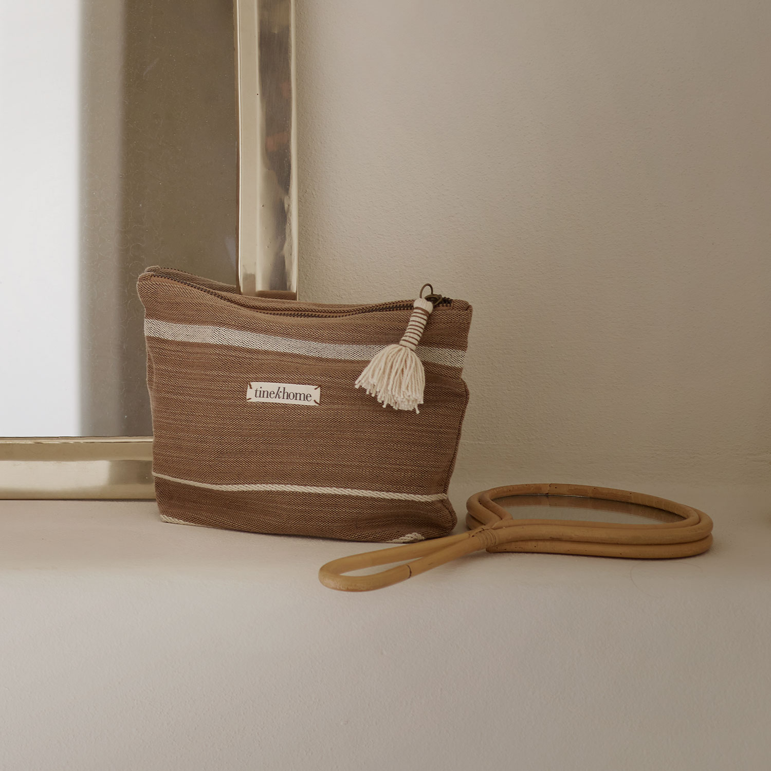 aesthetics with everyday functionality. Crafted from 100% yarn-dyed cotton and detailed with subtle stripes, it is the perfect addition for organising your essentials at home or on the go. With its spacious yet soft design, it adds understated charm to your bathroom or suitcase while taking up no more room than the items you carry.