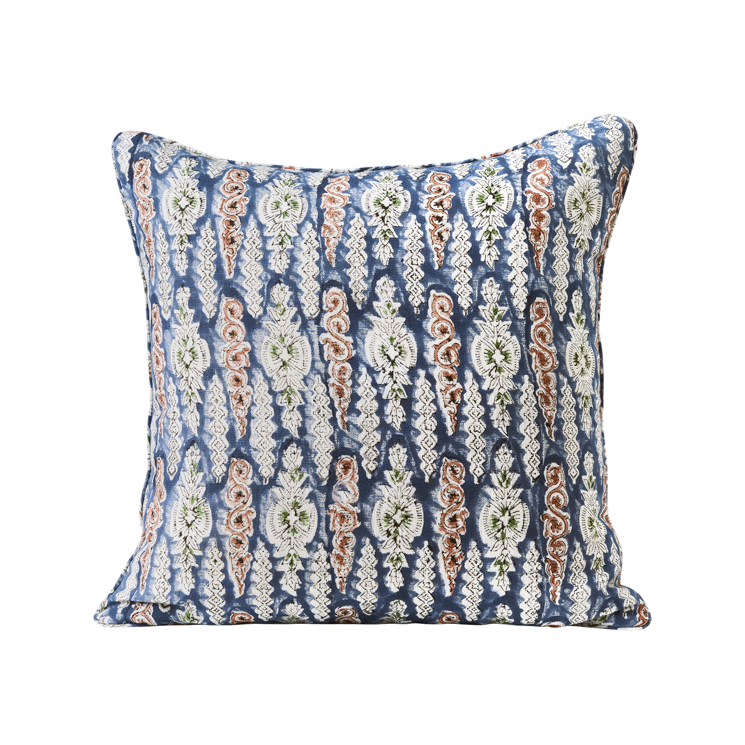 Cushion cover designed by use of the traditional Indian blockprint technique. The prints on the cushion cover are handmade and showcase different ornaments, making the item a statement piece.
