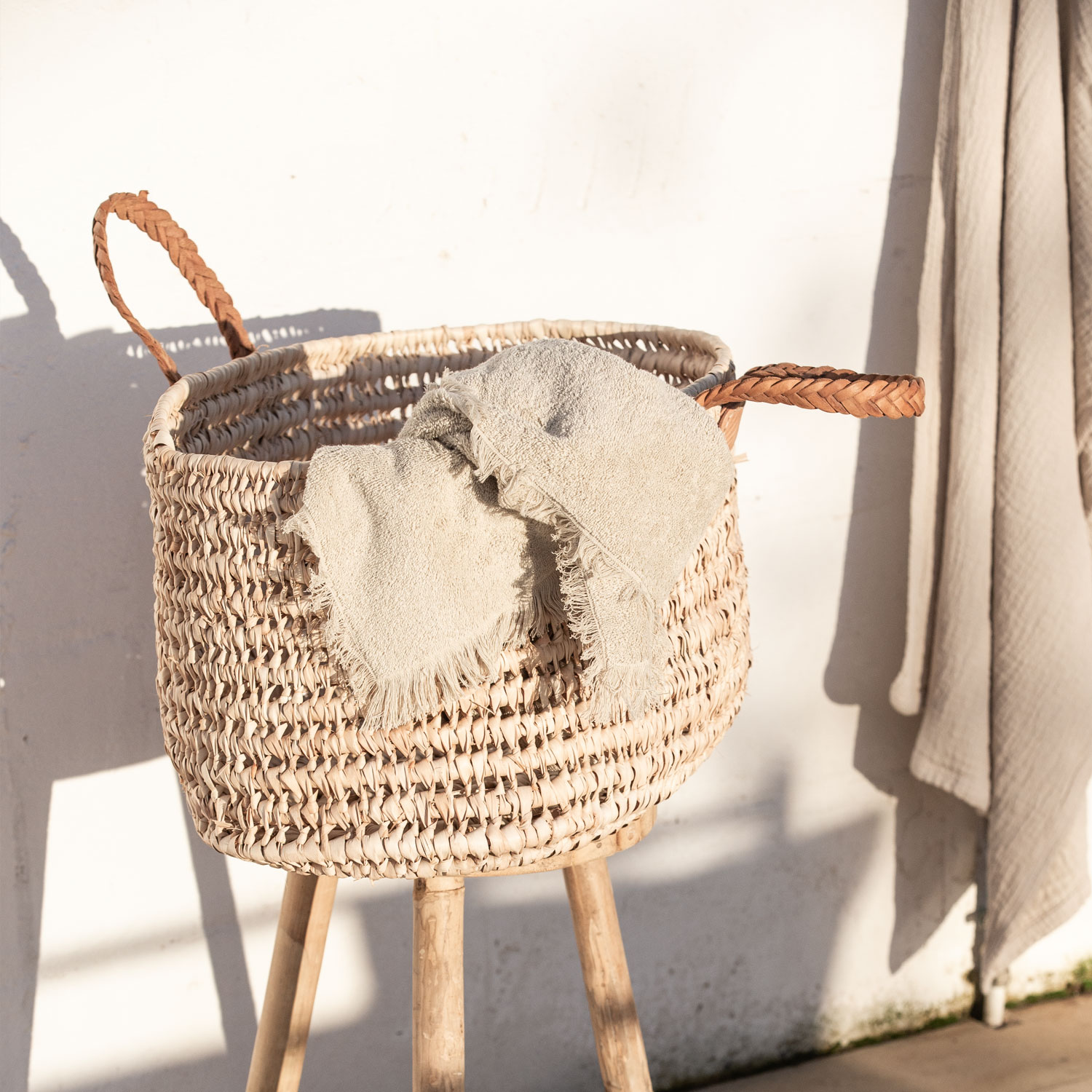 Weaved basket with plenty of space and flat braided leather handles. The basket stands easily on the floor or shelves and can be used for storage and the towels for a trip to the beach.