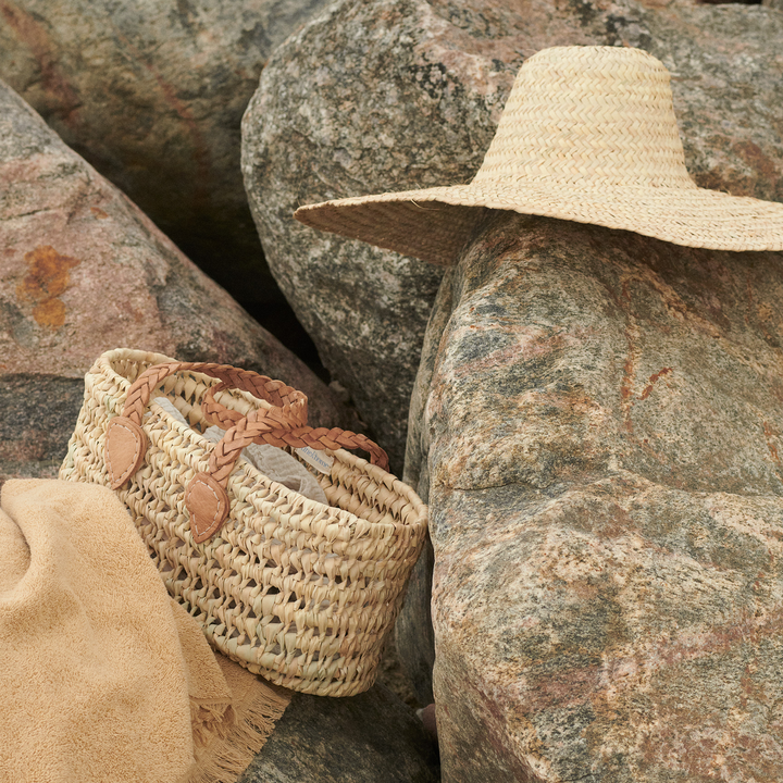 A woven bag with flat leather handles. The bag stands securely on floors or shelves and is well suited for storage at home, smaller shopping trips, or for carrying towels and personal items to the beach.
