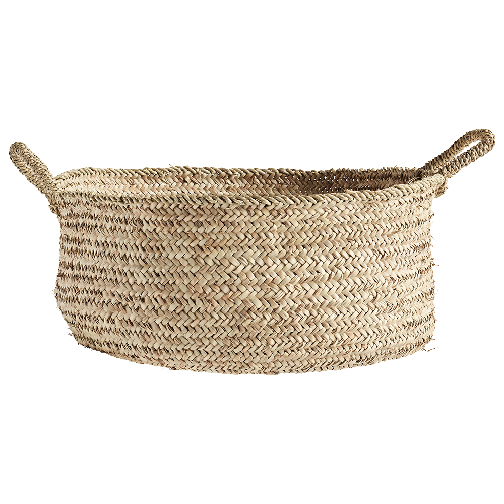 The basket is handmade and braided with palm leaves. The basket has small handles.