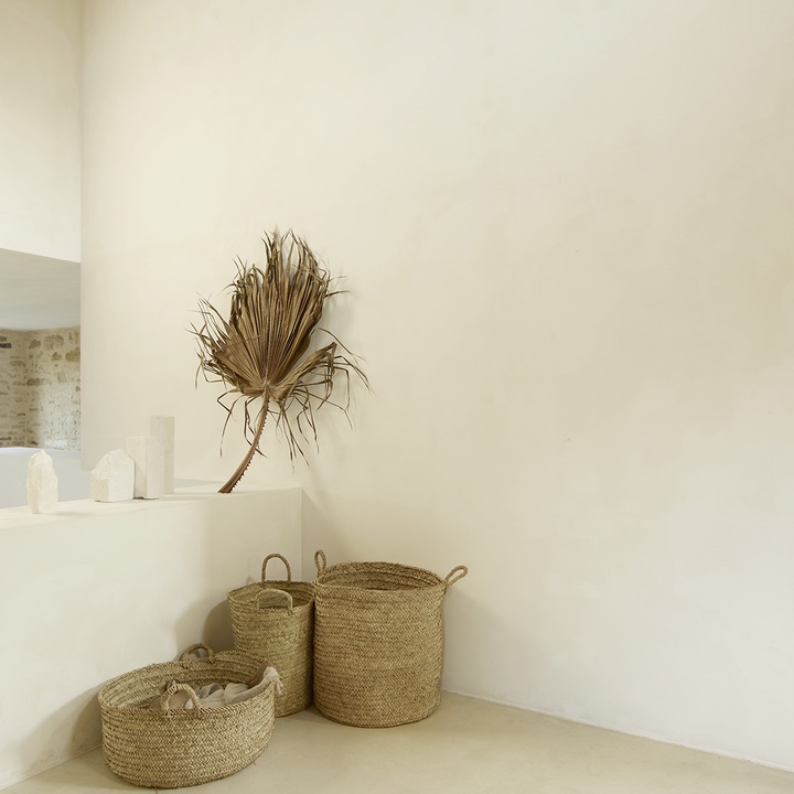 A round basket handwoven from palm leaves for storage around the home. The basket works well for decorative storage in the living room, bedroom, or bathroom.
