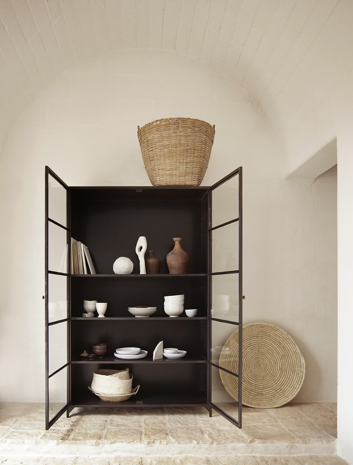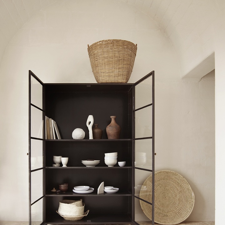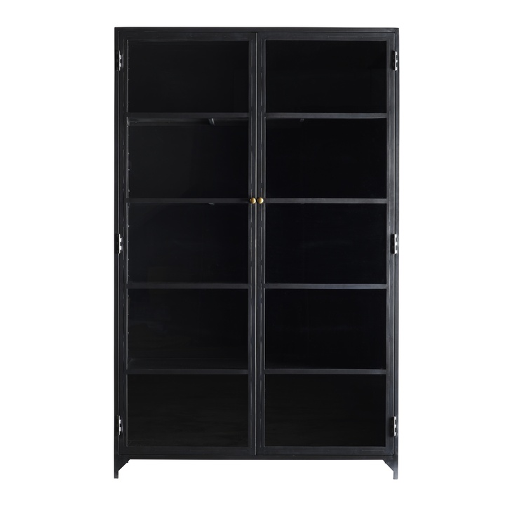 Cabinet in black-painted metal. The cabinet has two glass doors, and four shelves, where one is adjustable. Large, spacious cabinet for storage and display of beautiful objects, books and ceramics.