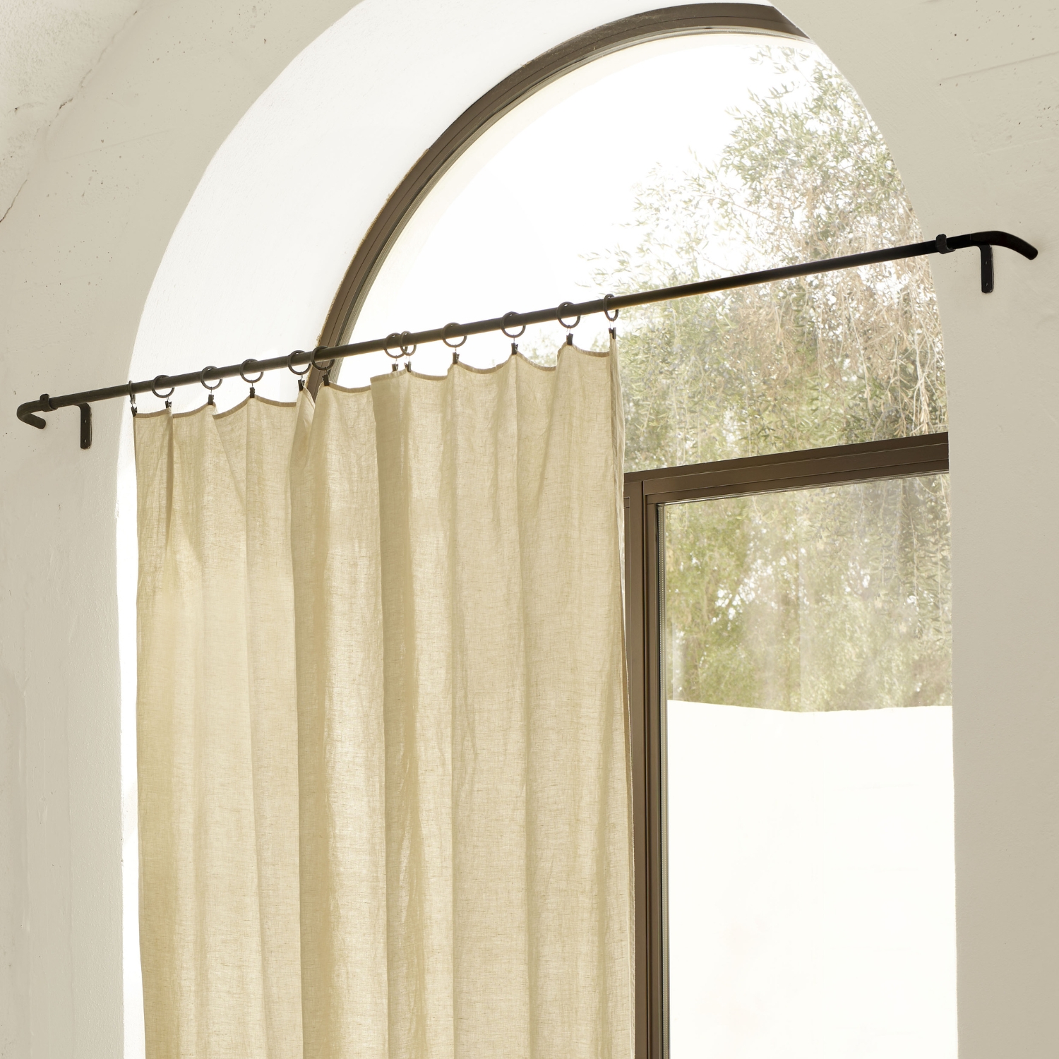 Handmade curtain rod in black iron that beautifully frames the windows with soft floating fabrics.