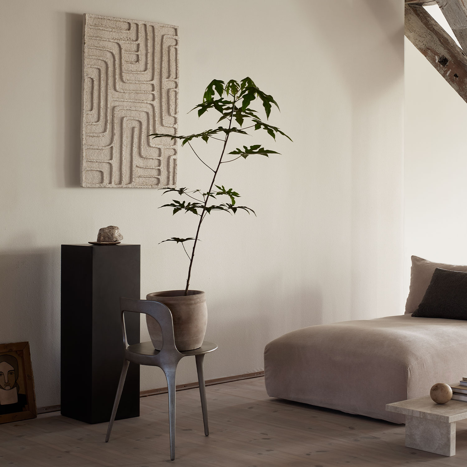 Aesthetic clay pot with a finely detailed surface that complements both summer hues and autumn's deeper tones. The pot has a beautiful, simple shape and is perfect for plants, decorative branches, or flowers.