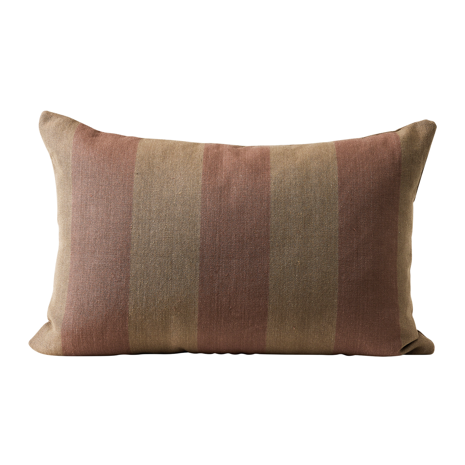 This is the Jopmega40-oldrose. A hazel-coloured cushion cover with stripes in the colour old rose, which ensures a warm-toned edition to your home.