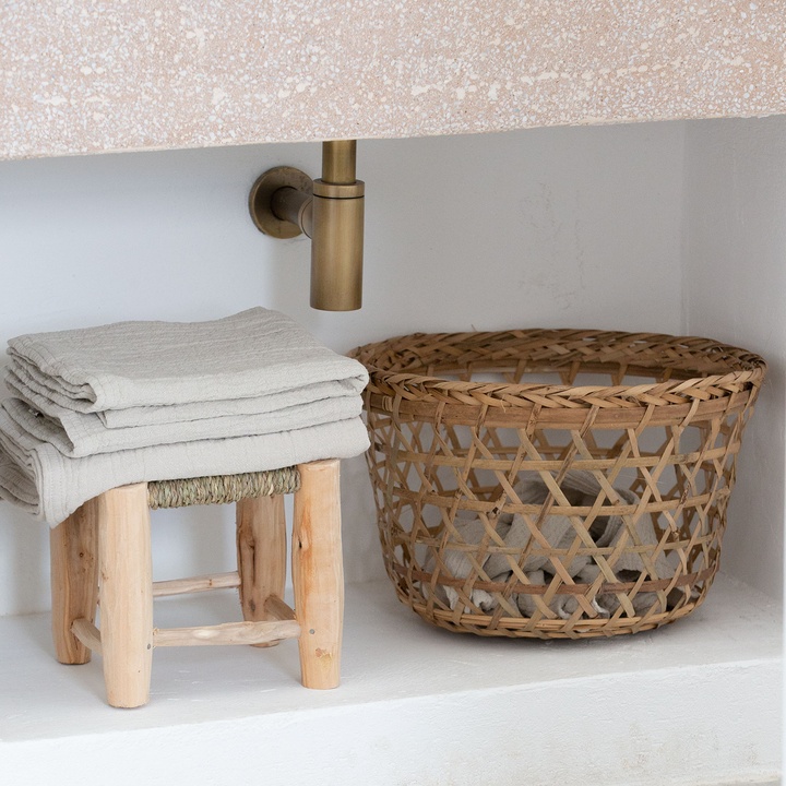 Market basket for storage of towels or other fabrics. Use the basket in the bathroom where it adds a light expression to the room.