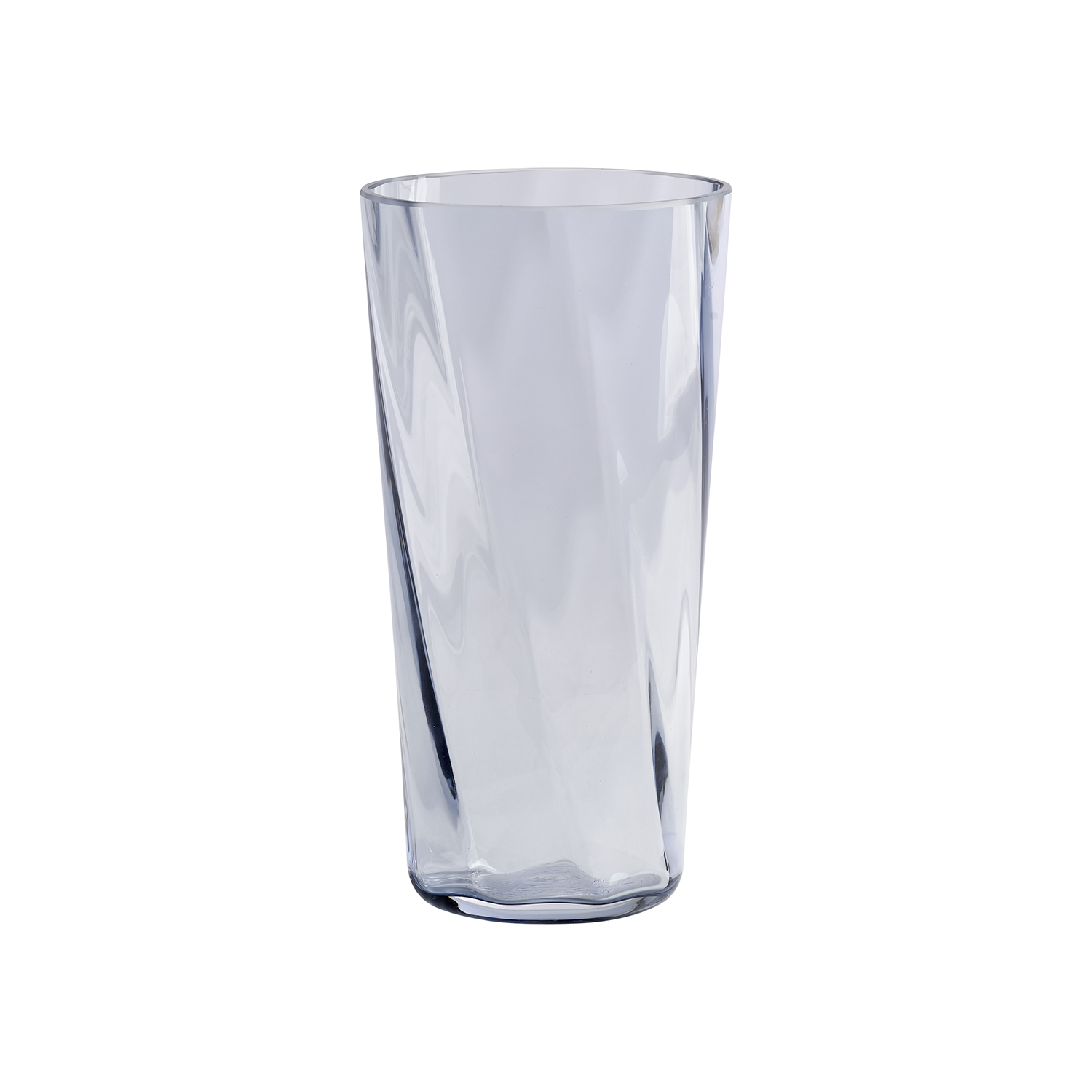 A mouth blown, swirl vase in the colour sky. Due to the translucent coloured glass, the reflection of the glass is beautiful and subtle. Fill the vase with some small, dried flowers or use it as a oversized tea light holder.